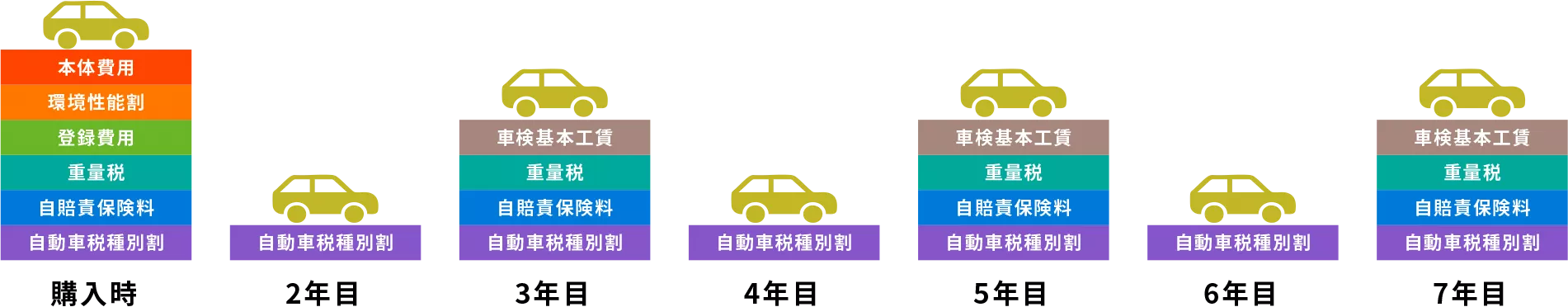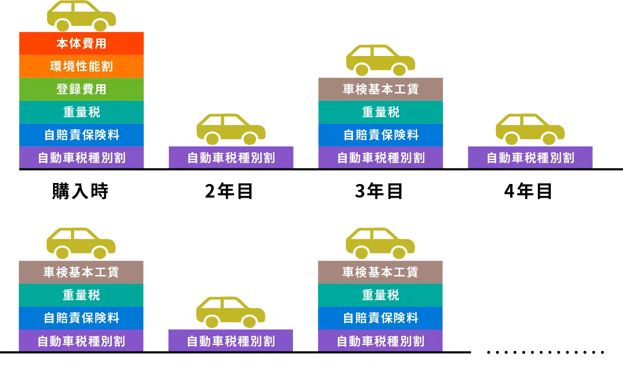 必要な費用は、年によってマチマチ…。購入時、車検時にまとまった費用が必要。